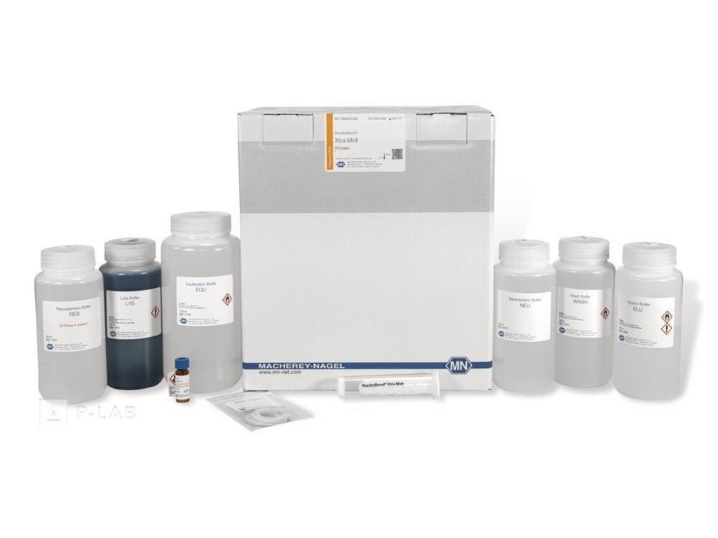 Kit obsahuje: pufry RES, LYS, NEU, EQU, WASH a ELU, RNáza lyofilizovaná, NucleoBond® Xtra Midi kolonky (s filtry), znovupoužitelné podložky pro kolonky, izolační protokol