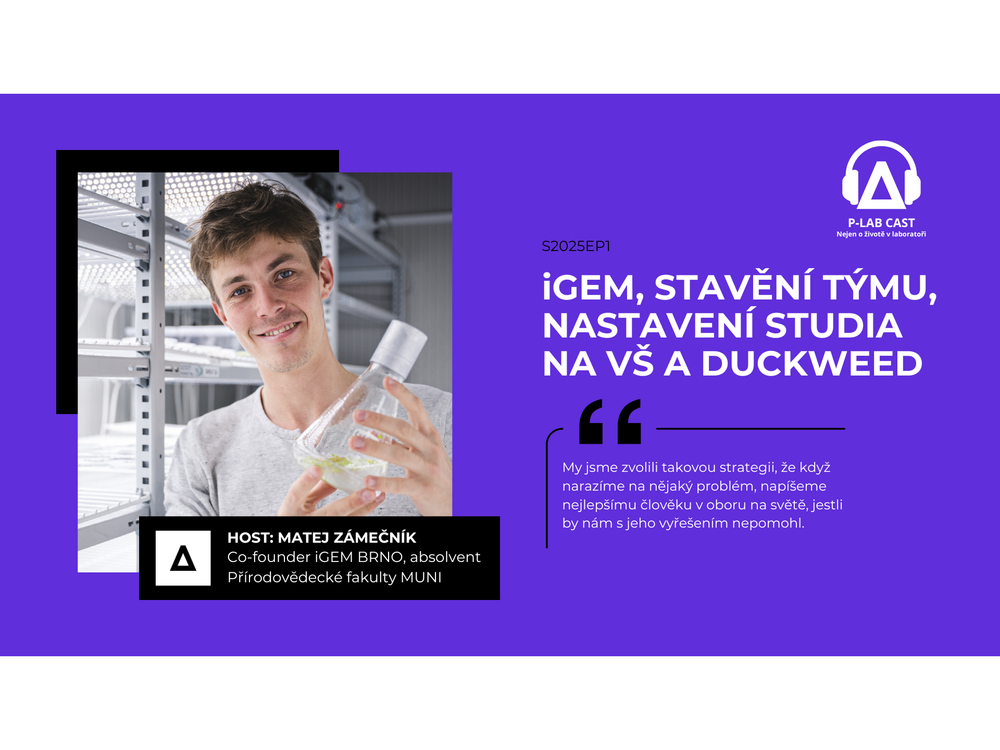 Poslechněte si úvodní epizodu P-LAB CASTu, podcastu nejen o životě v laboratoři, který se natáčel na půdě brněnských univerzit a jehož hostem byl Mgr. Matej Zámečník, co-founder projektu iGEM Brno a absolvent Přírodovědecké fakulty MUNI. V rozhovoru prozrazuje, jak se tvořil tým na prestižní projekt a mezinárodní soutěž, která vyvrcholí v Paříži, jak se proměnil samotný záměr a vývoj duckweedu (okřehek) nebo co si sliboval od crowdfunding kampaně a kde všude sháněl se svým týmem financování.